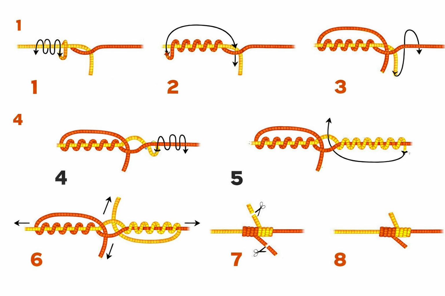 The double uni combines two uni knots facing each other. It's excellent for connecting braided backing to mono, fluorocarbon to mono, or any two lines that might be difficult to join with a blood knot.