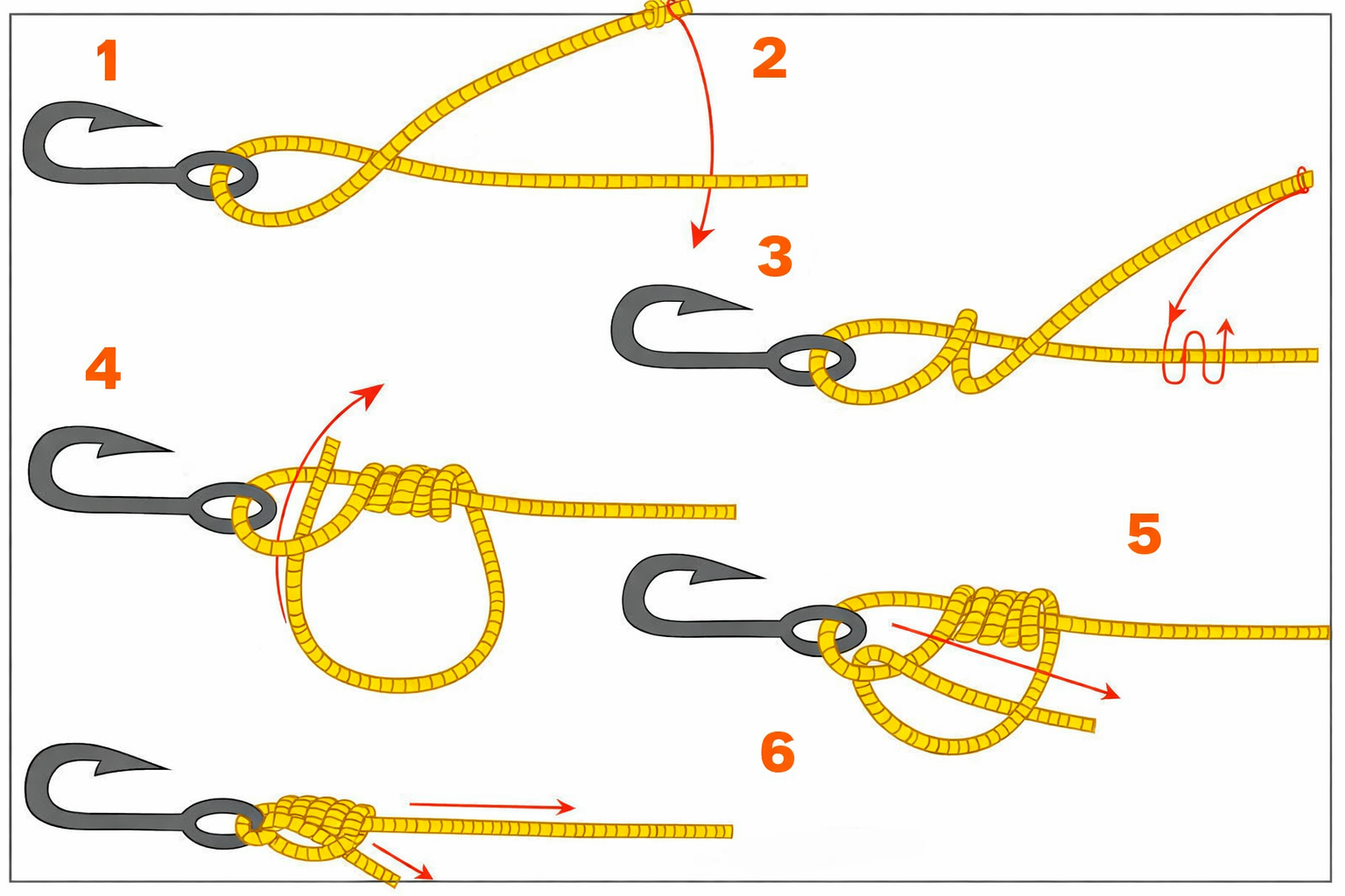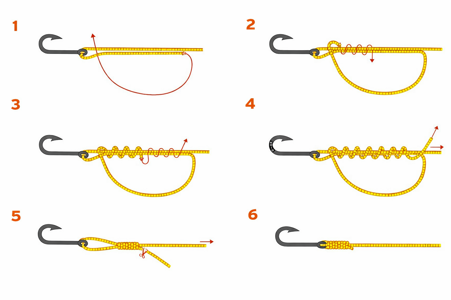 - Pass the line through the hook eye, leaving 6 inches of tag